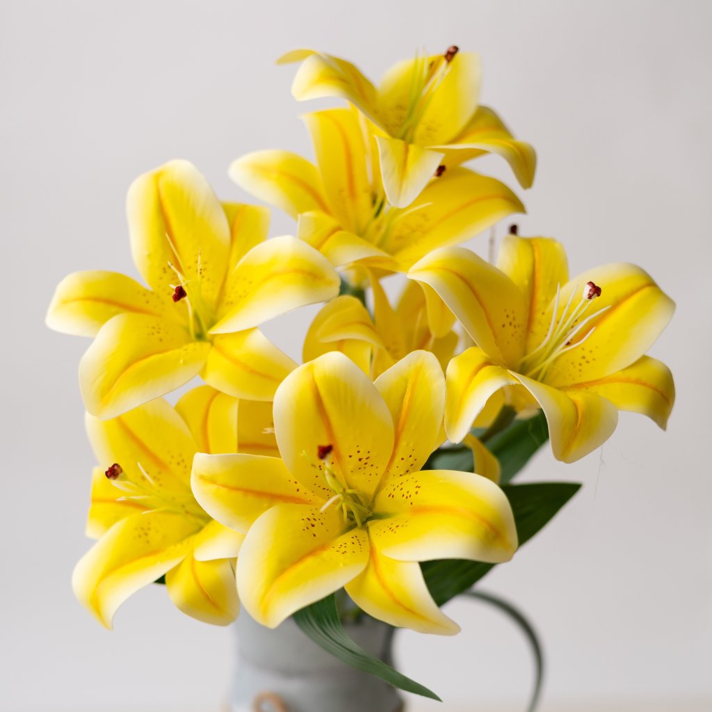 Pogumovaná kytica Ľalia ŽLTÁ s piestikmi 51cm. Pogumované kvietky zaručujú kvalitu a nevyblednutie na slnku pri použití v smútočných aranžmánoch.