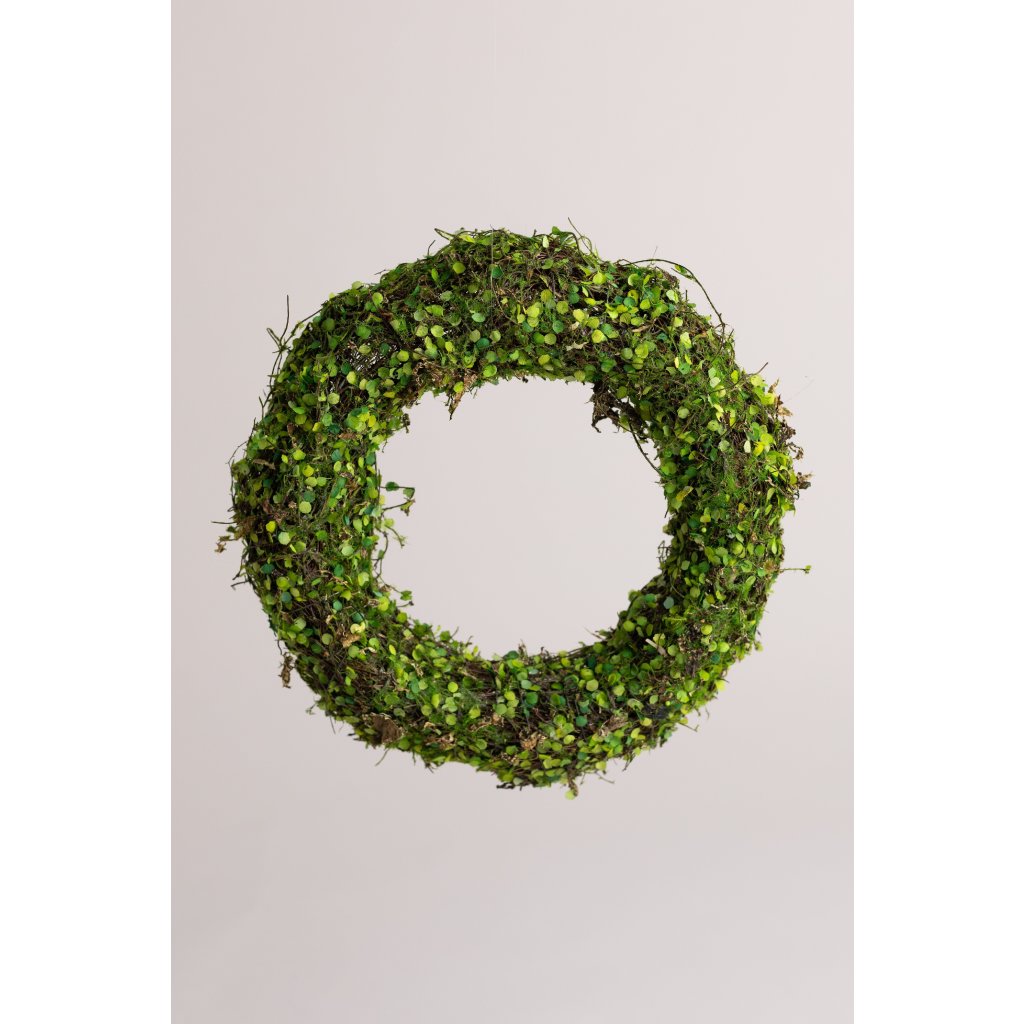Prútený veniec s jemným machovým materiálom, ktorý dopĺňajú drobné textilné bodky. Výška venčeka je 7 cm. a priemer 30cm. Vhodný na výrobu aranžmánov a zdobených venčekov.