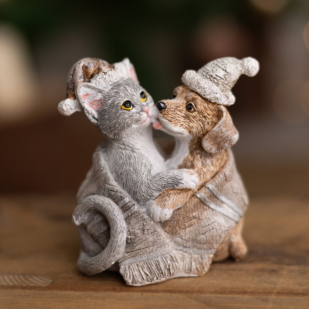 Nezvyčajná vianočná dekorácia Psík a mačička s čiapkami 9x5x8cm. Polyresin.