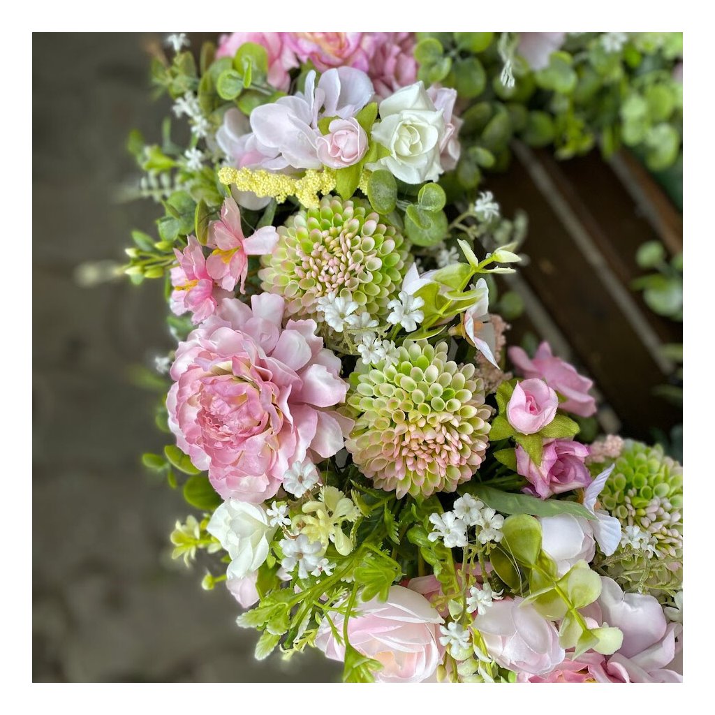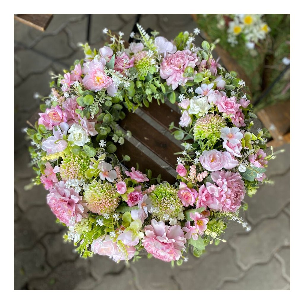 Romantický veniec v ružových tónoch s priemerom 47cm. Použitý je kvalitný materiál.