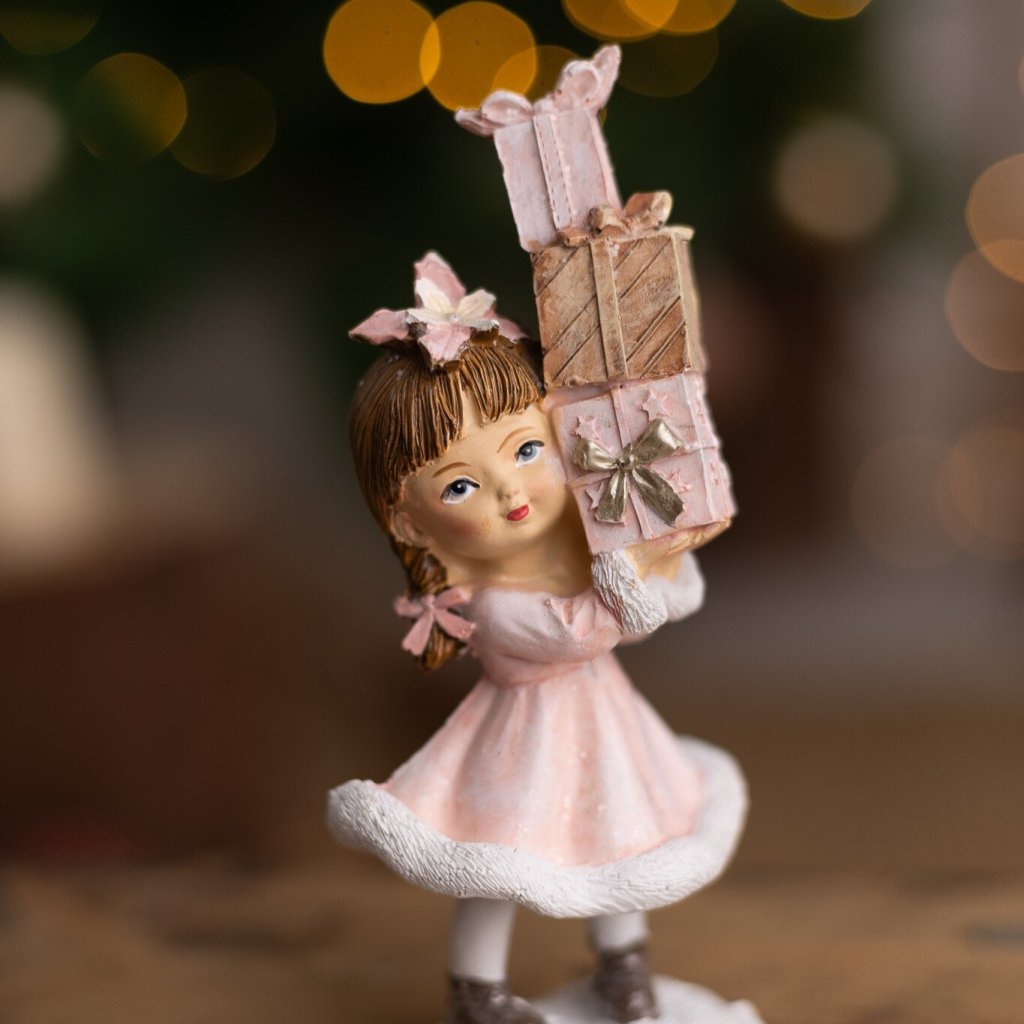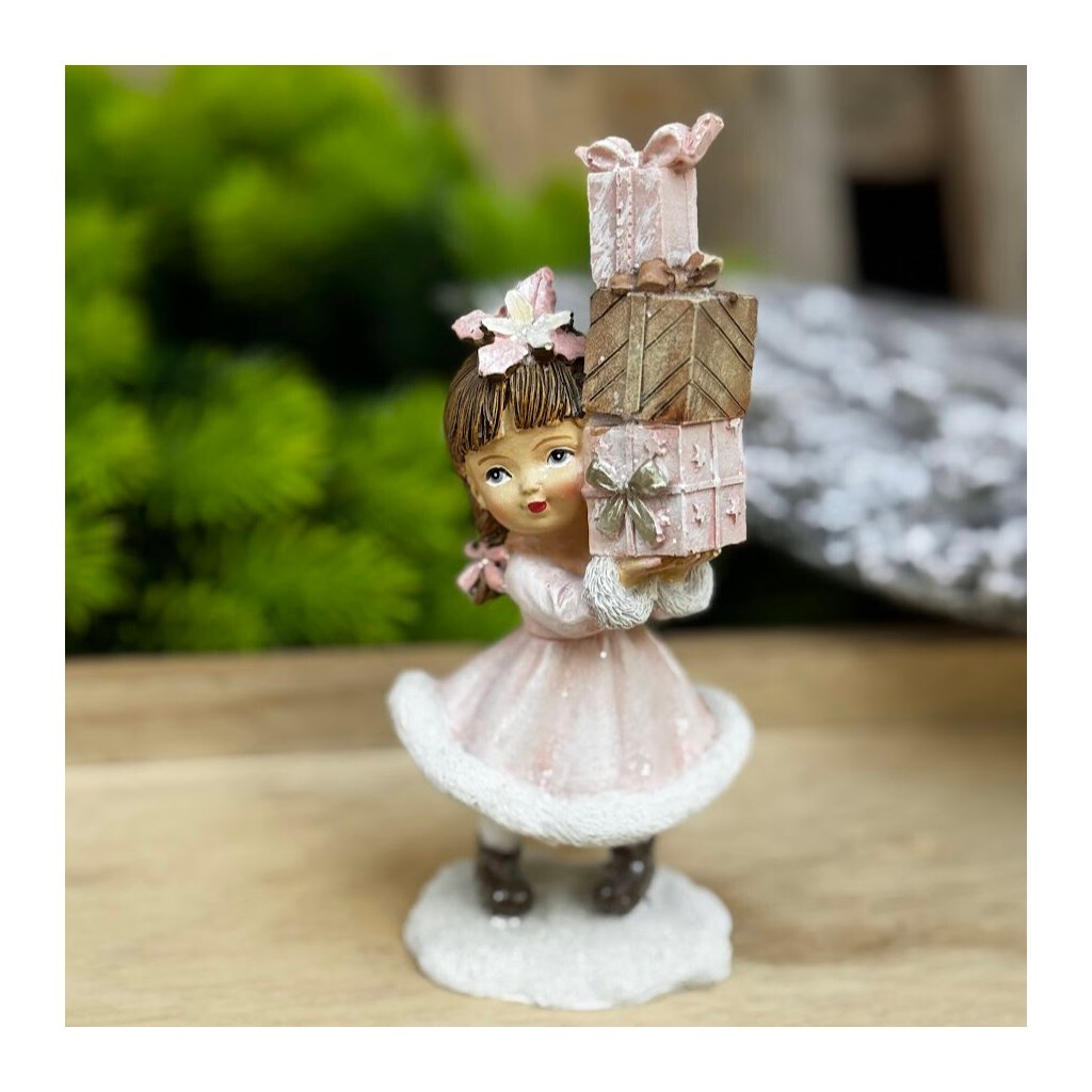 Vianočná postavička Ružové dievčatko s balíčkami 15,5 x 5,5 x 7 cm.