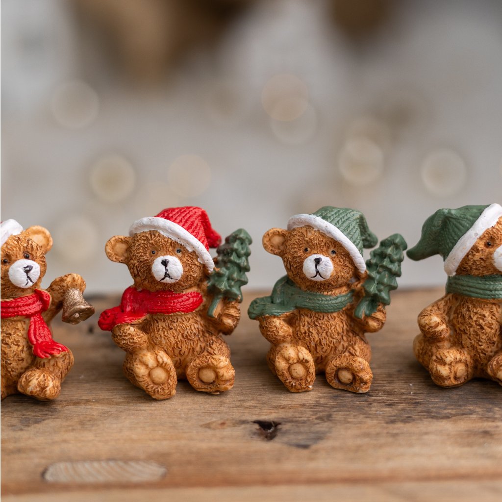 4ks sediaci medvedíkovia so stromčekom a zvončekom 5cm. Polyresin.