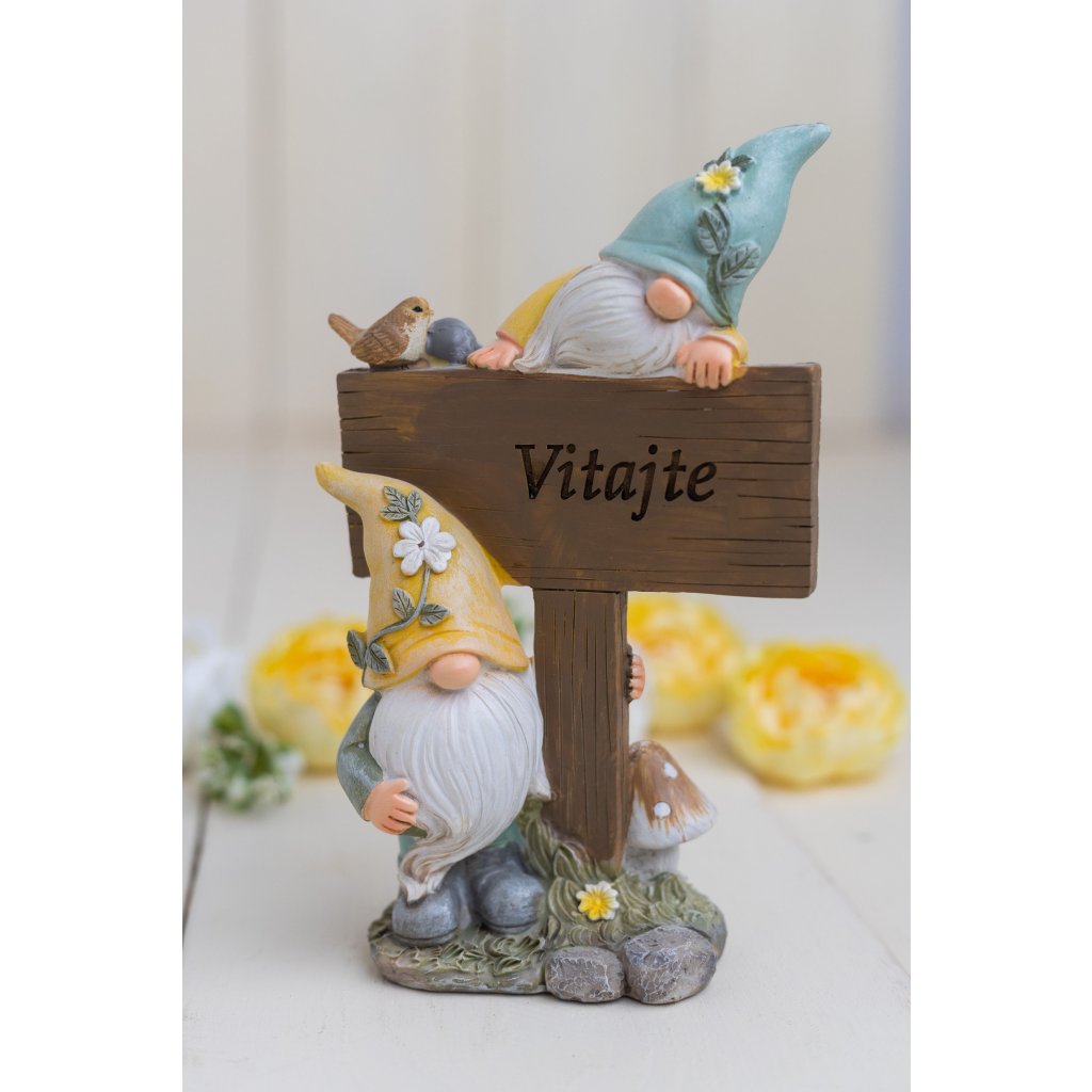 Títo rozkošní skriatkovia z polyresinu s tabuľkou „VITAJTE“ sú ideálnou dekoráciou na privítanie návštev a spríjemnenie vášho domova. Veselý motív dvoch skriatkov s dlhými bradami, jarnými čiapkami a drobnými detailmi, ako sú kvietky, vtáčik či hubky, pôsobí hravo a zároveň útulne.