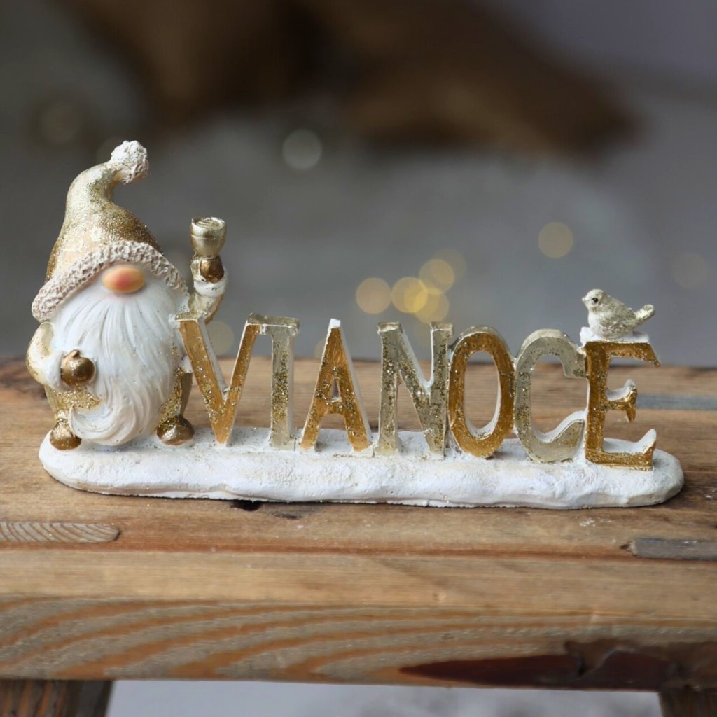 Vianočná postavička zlatý Škriatok s nápisom Vianoce 15cm. Polyresin.
