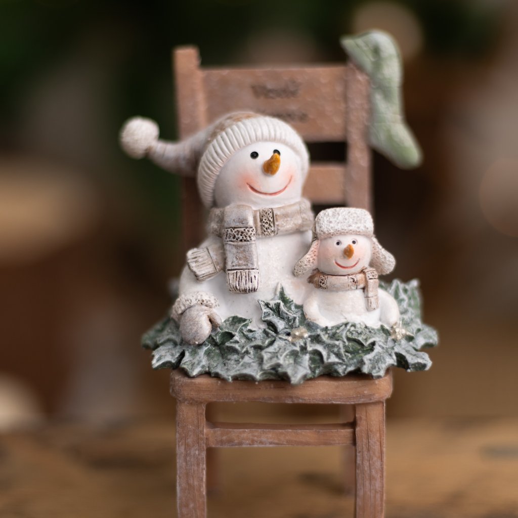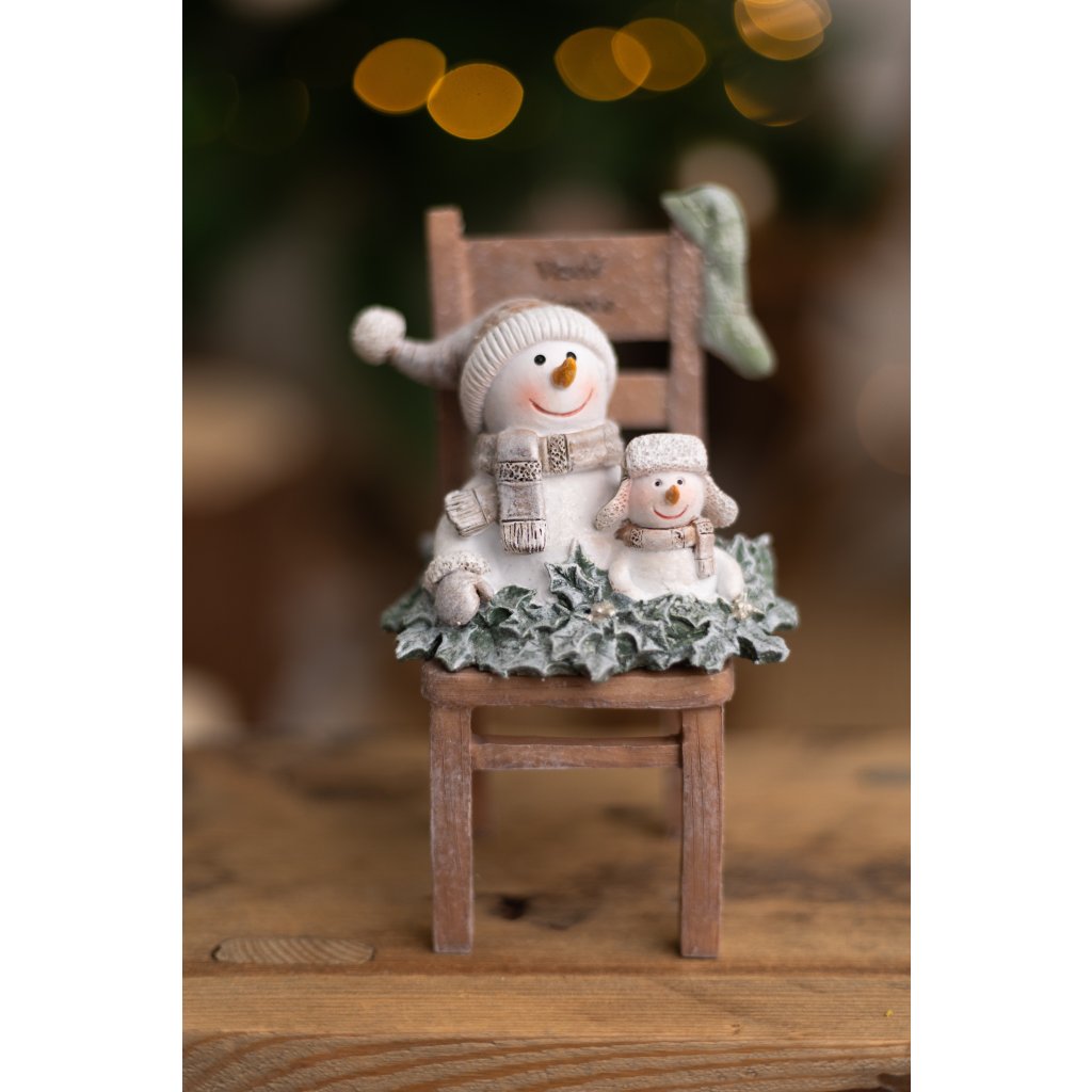 Vianočná postavička Snehuliaci na stoličke s nápisom Veselé Vianoce 14x9x7cm. Polyresin.
