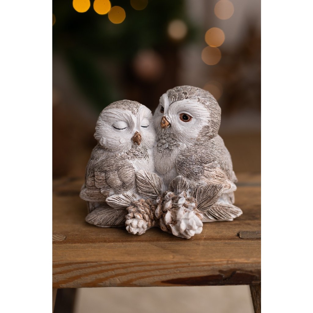Krásna postavička párik sovičiek so šiškami 9 x 11,5 x 9,5 cm. Jemný gliter. Polyresin.