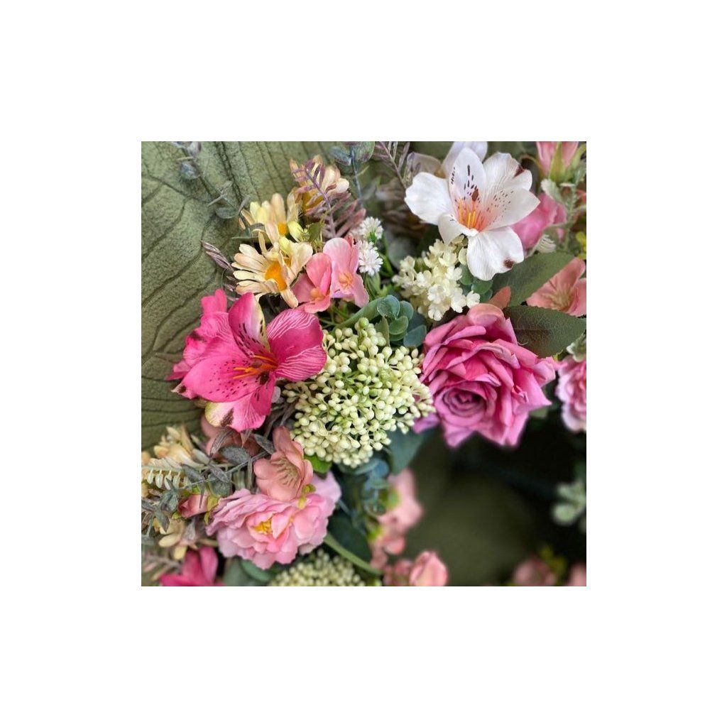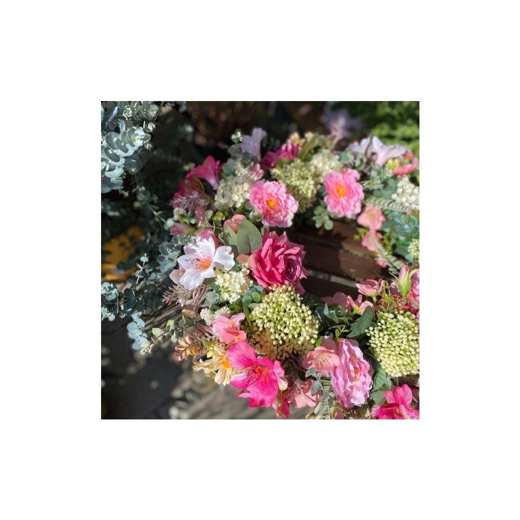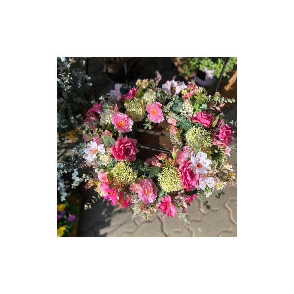 Strapatý veniec v ružových tónoch s krásnymi ružami a alstromériou. Priemer venčeku je 47cm. Použitý je kvalitný materiál.