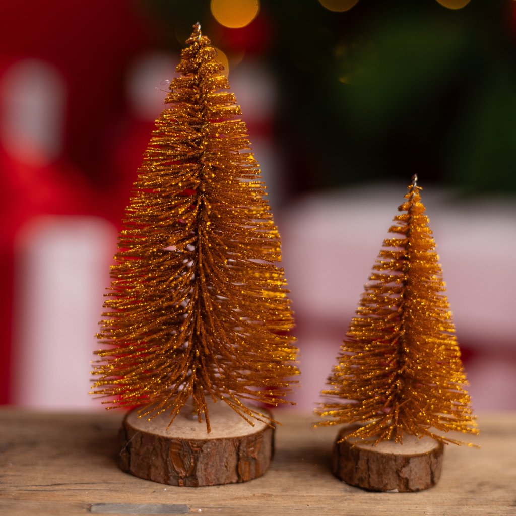 Stromček na drevenom pníku MEDENÝ s glitrami 8cm.