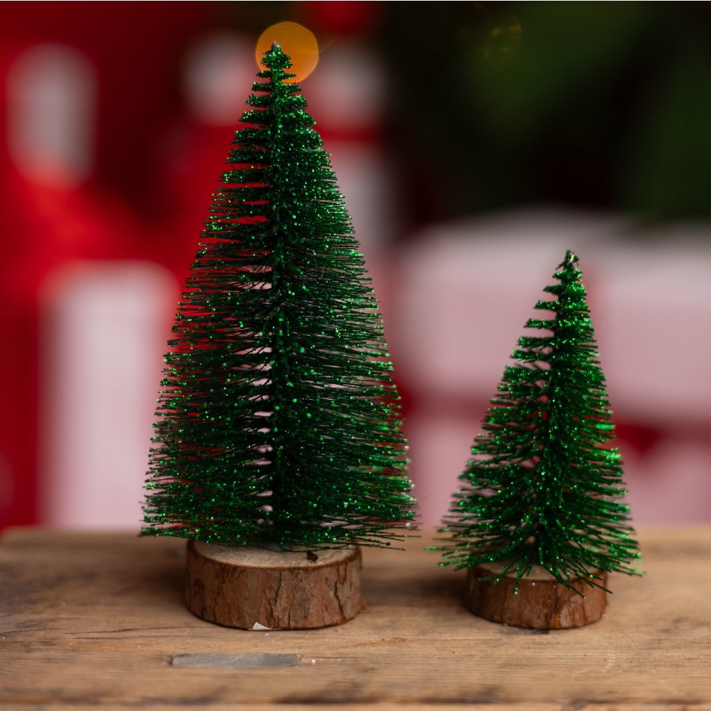 Stromček na drevenom pníku ZELENÝ s glitrami 8cm.