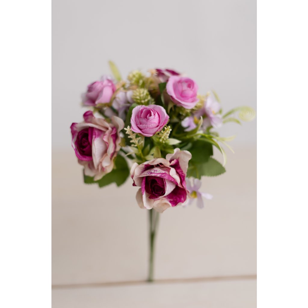 Dekoratívna kytička ružičiek pôsobí ako sušené kvietky v šušťavom prevedení, prirodzene a veľmi elegantne. Kombinácia odtieňov spolu so zelenými lístkami vytvára harmonický a nadčasový vzhľad. Kytička má 7 pevných stoniek, vďaka čomu je bohatá a výrazná.