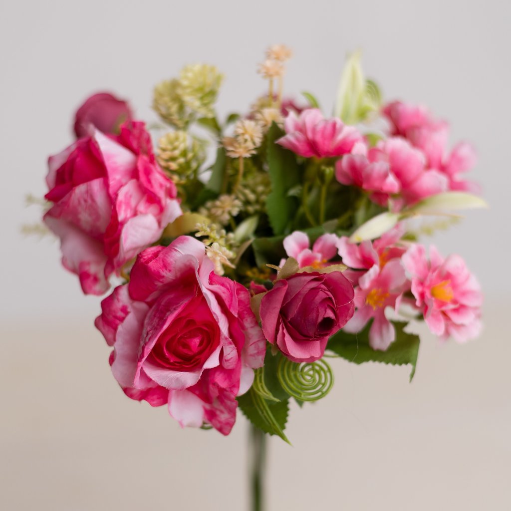 Dekoratívna kytička ružičiek pôsobí ako sušené kvietky v šušťavom prevedení, prirodzene a veľmi elegantne. Kombinácia odtieňov spolu so zelenými lístkami vytvára harmonický a nadčasový vzhľad. Kytička má 7 pevných stoniek, vďaka čomu je bohatá a výrazná.