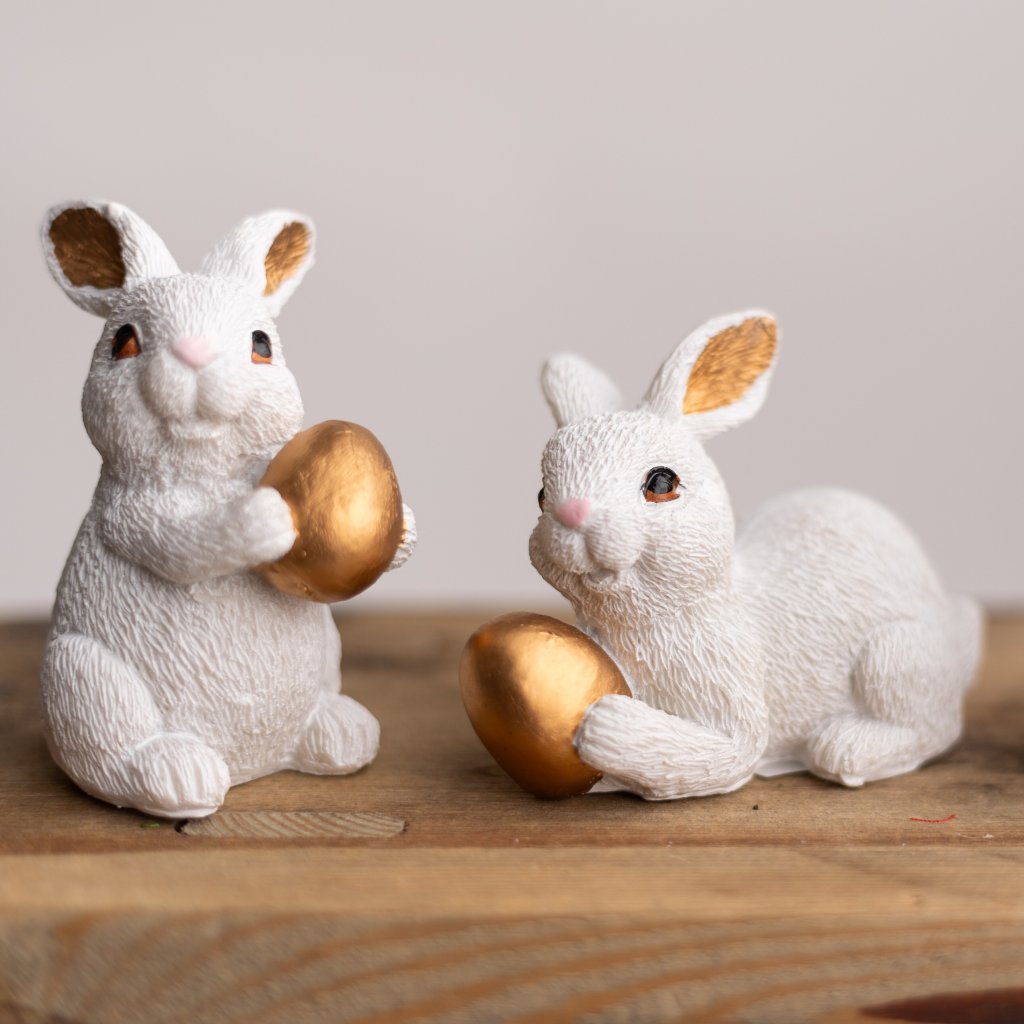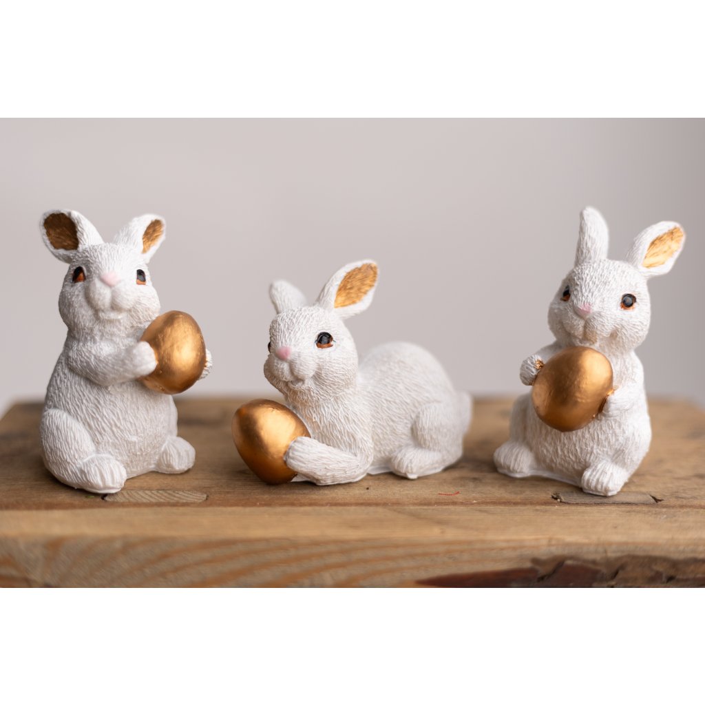 Figúrky sú vyrobené z kvalitného polyresinu, ktorý umožňuje detailné spracovanie srsti aj jemných výrazov. Biela farba zajačikov v kombinácii so zlatým vajíčkom vytvára vkusný kontrast, ktorý sa ľahko kombinuje s prírodnými, jarnými aj modernými veľkonočnými dekoráciami.