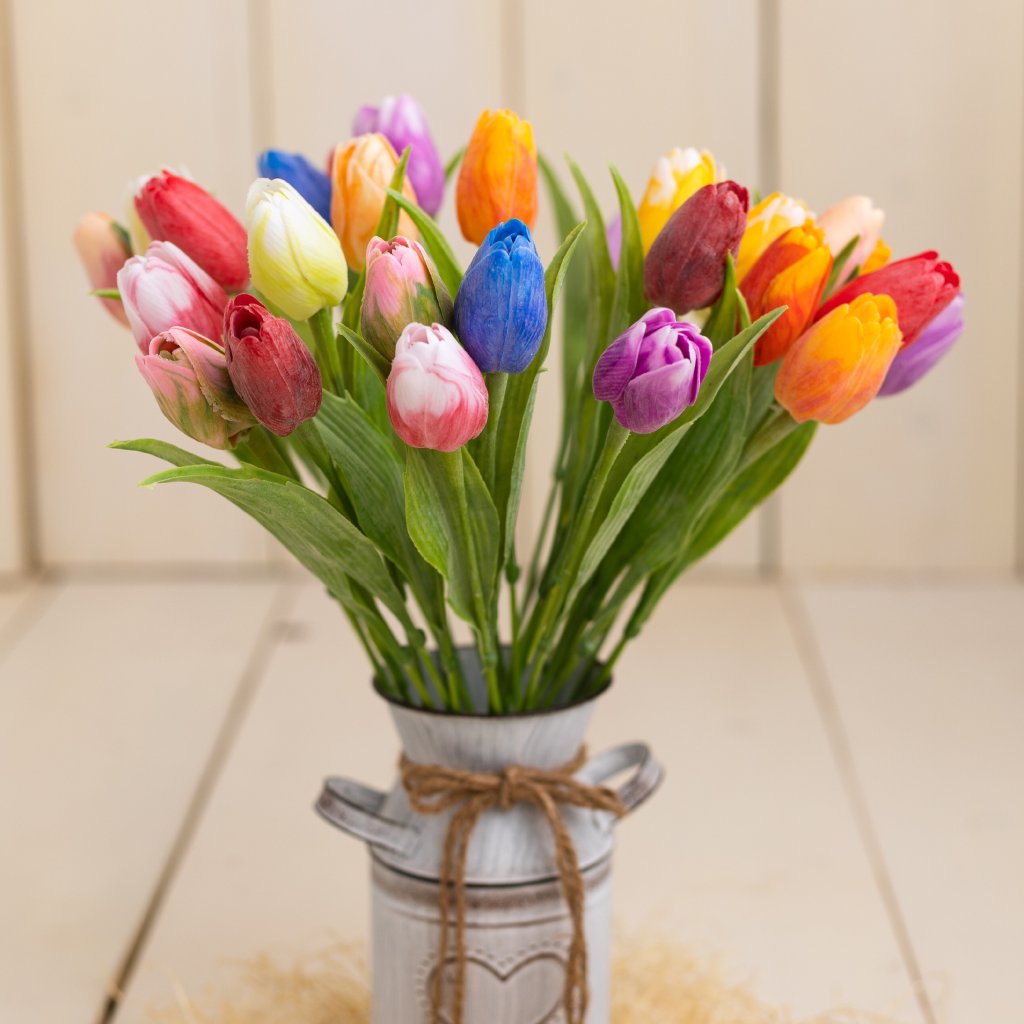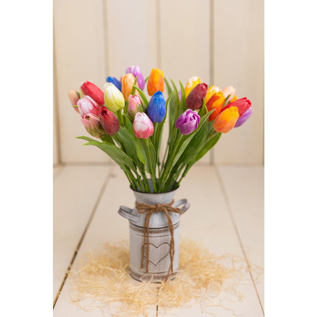 Mix tulipánov v rustikálnom prevedení zaujme svojím jemne poprášeným efektom, ktorý dodáva kvetom prirodzený, akoby mierne patinovaný vzhľad. Tulipány pôsobia realisticky – ako živé – vďaka detailnému spracovaniu hlavičiek, listov a prirodzeným farebným prechodom.