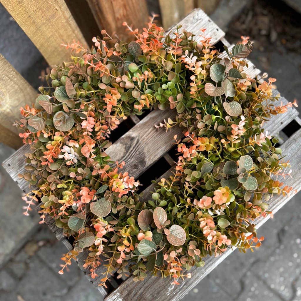 Exkluzívny veniec z eukalyptu v nežných marhuľových a zelených tónoch prináša do priestoru pocit prirodzenej harmónie a nadčasovej elegancie. Jemne tónované lístky s realistickou textúrou vytvárajú bohatý, vyvážený vzhľad, ktorý pôsobí luxusne a zároveň veľmi prirodzene. Precízne spracovanie z kvalitného umelého materiálu zaručuje dlhú životnosť, stálofarebnosť a úplnú bezúdržbovosť.