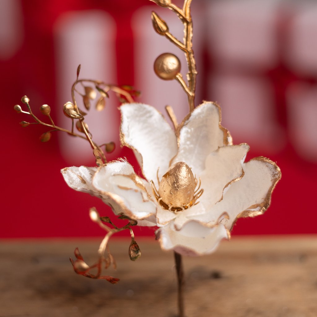 Vianočná magnólia s nádhernej krémovo zlatej farbe s prízdobami. Priemer 15cm.