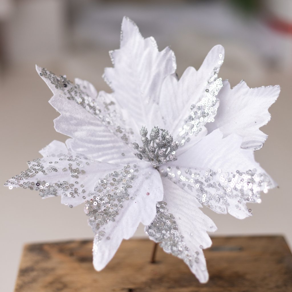 Biela vianočná ruža s flitrami, kvalitné vypracovanie. Priemer 25cm a výška 28cm.