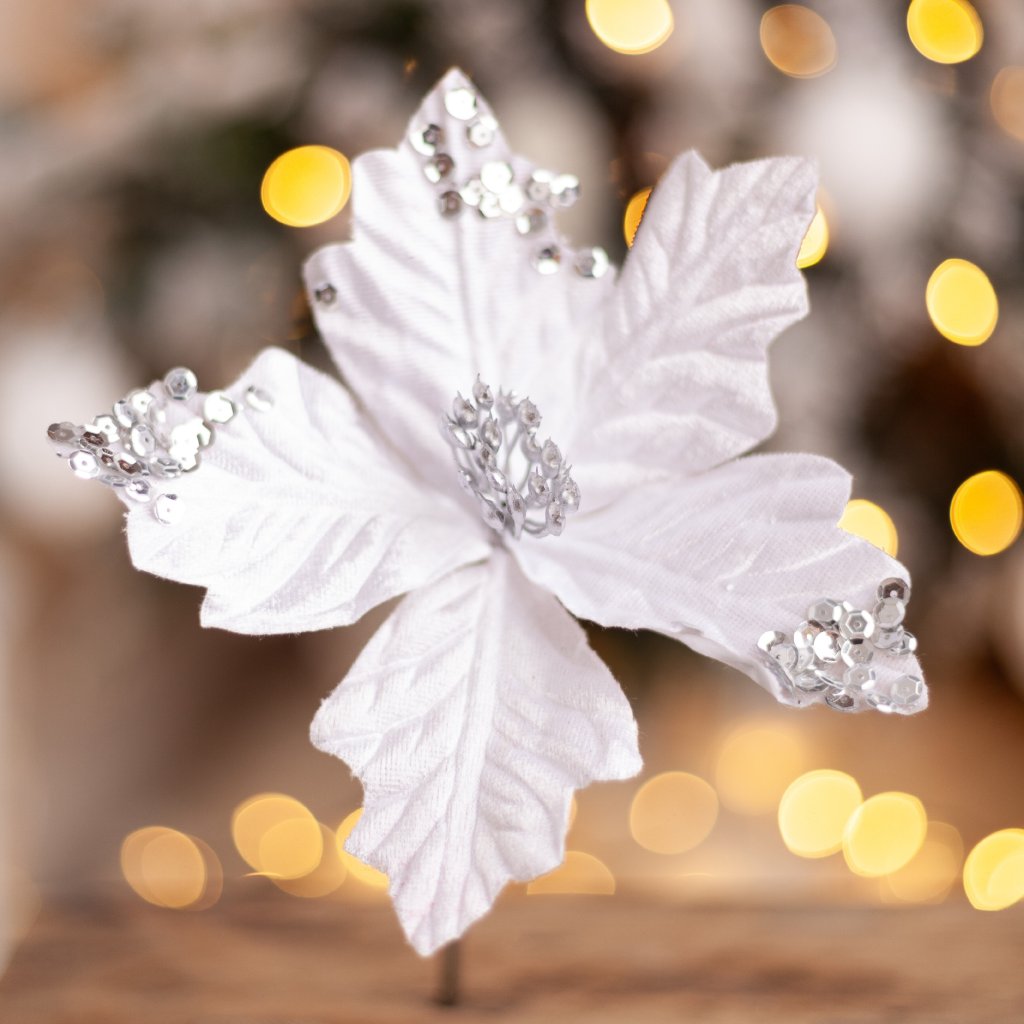 Vianočná ruža biela so striebornými flitrami, priemer 18cm a výška 24cm.
