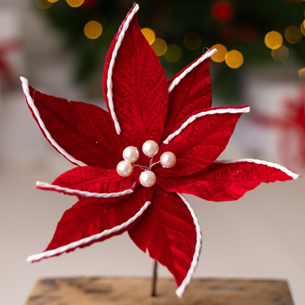 Krásna zamatová ruža s bielym okrajom a perleťovými guličkami. Priemer 24cm a výška 34cm.