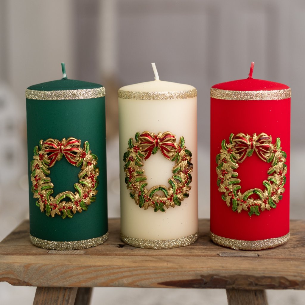 Vianočná sviečka s venčekom ČERVENÁ 14cm