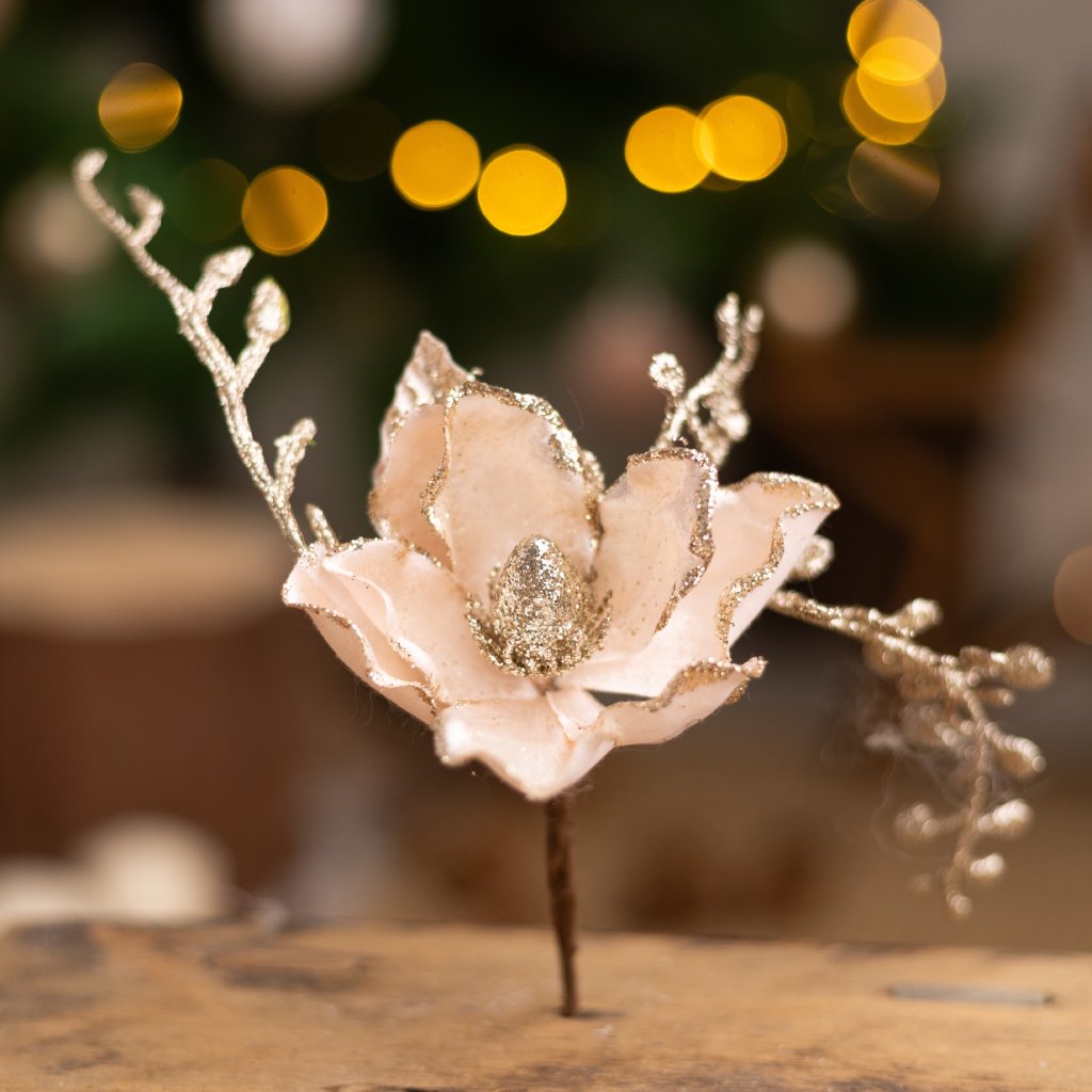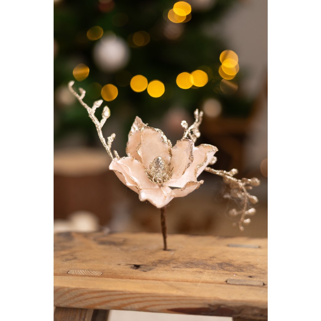 Umelá magnólia v elegantnej champagne farbe je ideálnym doplnkom pre vaše vianočné dekorácie. Jej jemné detaily a lesklé akcenty dodajú každému priestoru nádych luxusu. Perfektne sa hodí do kytíc, aranžmánov alebo ako samostatná dekorácia. Vytvorte si jedinečnú atmosféru s touto krásnou umelou kvetinou.
