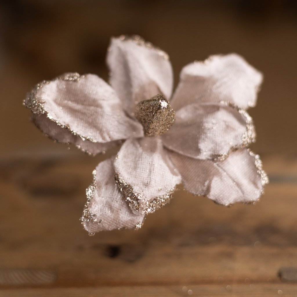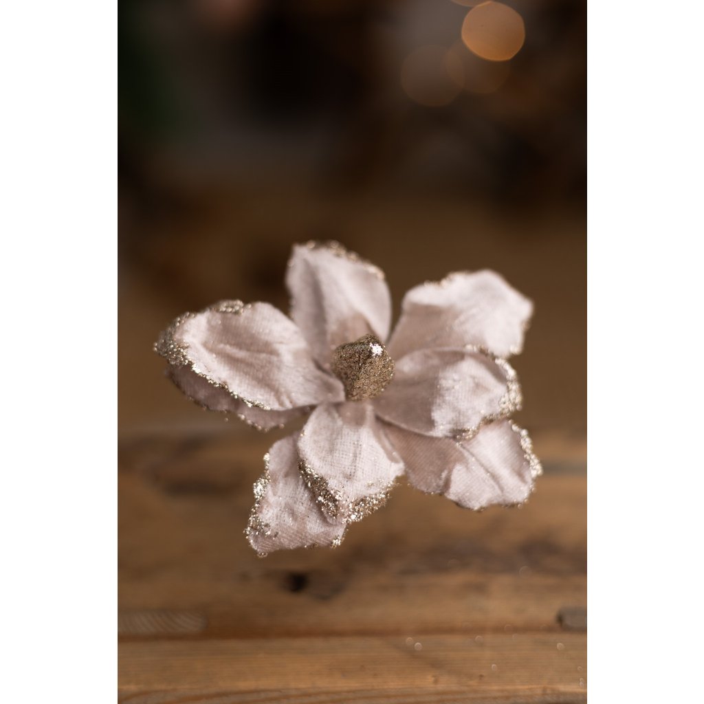Vianočná magnólia s trblietavým piestikom a jemným okrajom. Priemer 15cm.