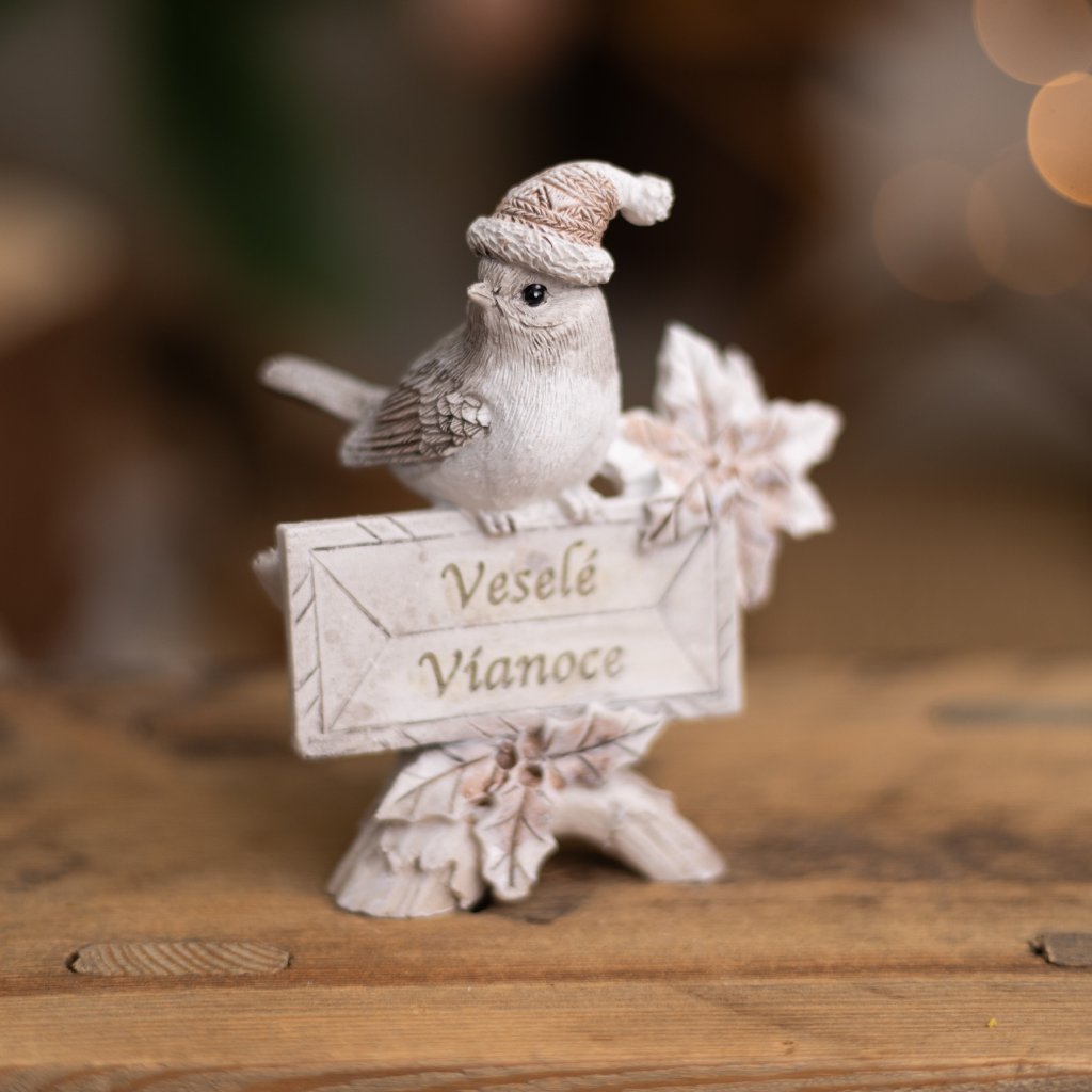 Vianočná postavička Vtáčik s tabuľkou Veselé Vianoce 11x10cm. Vhodný ako samostatná dekorácia, alebo súčasť vianočného aranžmánu. Polyresin.