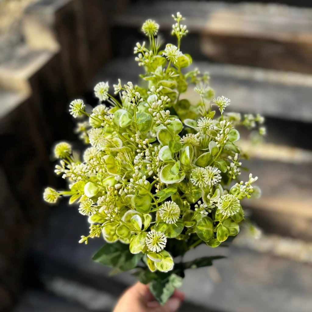 Dekoratívna hustá zelená kytička ďatelinky s množstvom drobných, prirodzene pôsobiacich lístočkov v rôznych odtieňoch zelenej. Vďaka bohatej štruktúre pôsobí sviežo a elegantne, krásne doplní samostatnú vázu aj väčšie kvetinové kompozície. Dĺžka 42 cm umožňuje jednoduché prispôsobenie – kytičku možno použiť vcelku alebo ju rozobrať na jednotlivé stonky pre tvorbu aranžmánov, vencov či dekorácií. Vhodná do interiéru aj exteriéru.