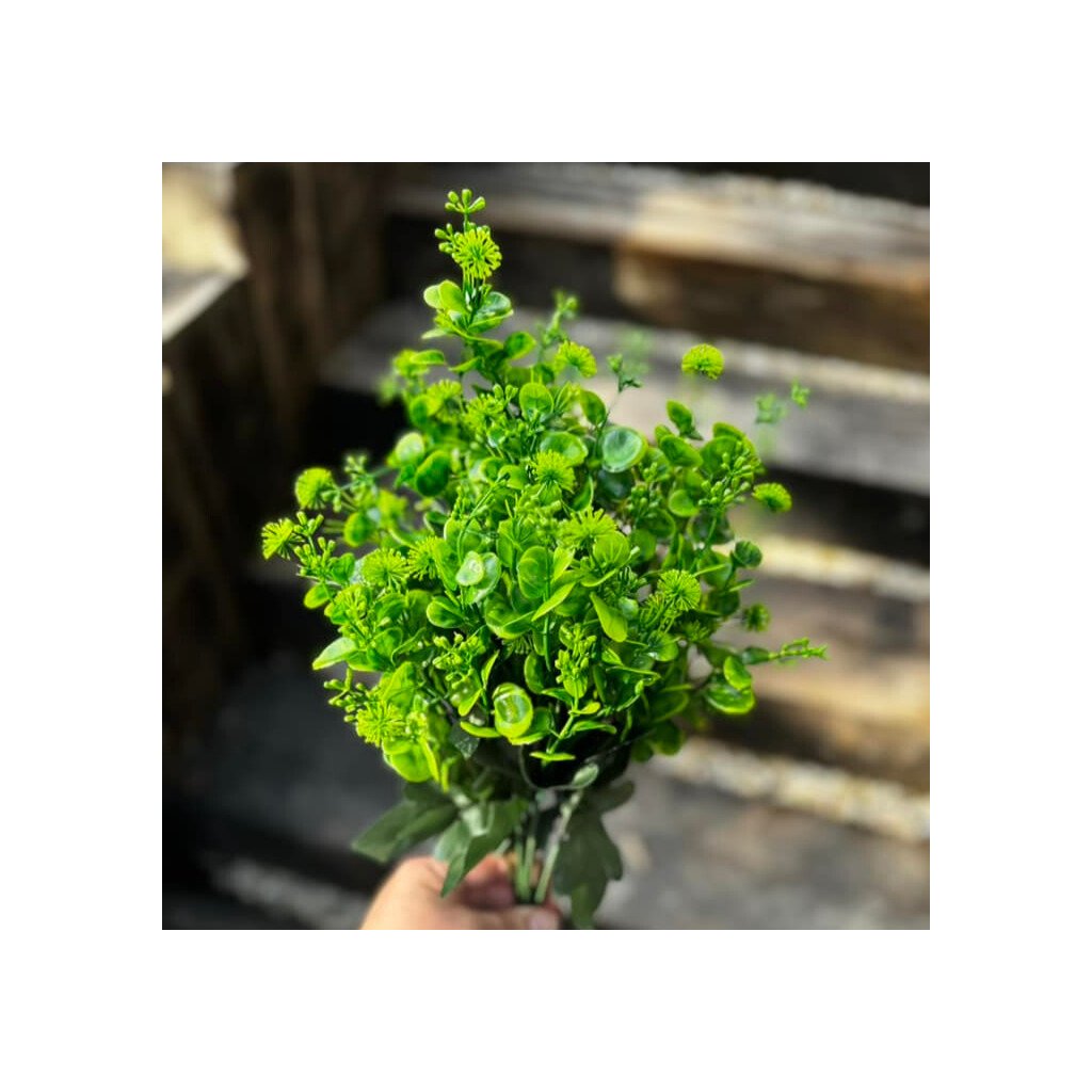 Dekoratívna hustá zelená kytička ďatelinky s množstvom drobných, prirodzene pôsobiacich lístočkov v rôznych odtieňoch zelenej. Vďaka bohatej štruktúre pôsobí sviežo a elegantne, krásne doplní samostatnú vázu aj väčšie kvetinové kompozície. Dĺžka 42 cm umožňuje jednoduché prispôsobenie – kytičku možno použiť vcelku alebo ju rozobrať na jednotlivé stonky pre tvorbu aranžmánov, vencov či dekorácií. Vhodná do interiéru aj exteriéru.