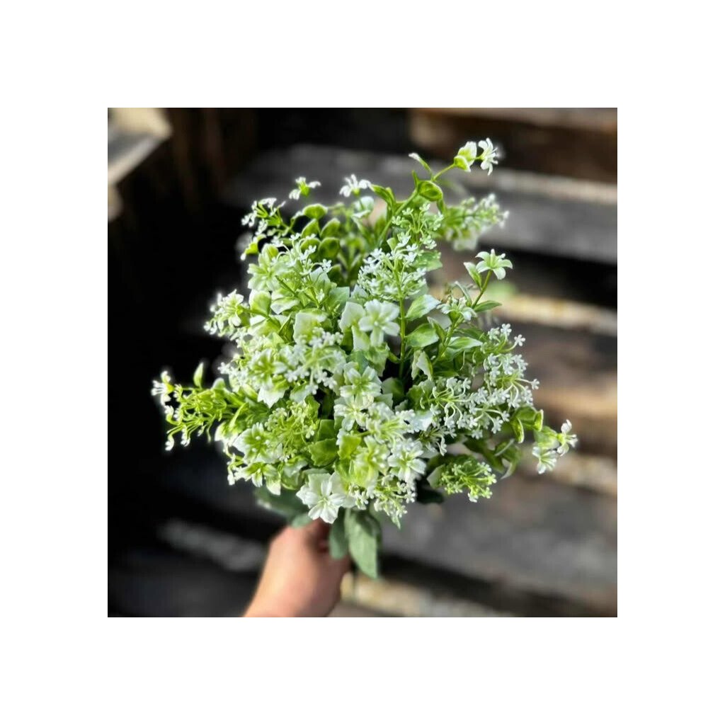 Dekoratívna hustá zelená kytička mix lístočky s množstvom drobných, prirodzene pôsobiacich lístočkov v rôznych odtieňoch zelenej. Vďaka bohatej štruktúre pôsobí sviežo a elegantne, krásne doplní samostatnú vázu aj väčšie kvetinové kompozície. Dĺžka 42 cm umožňuje jednoduché prispôsobenie – kytičku možno použiť vcelku alebo ju rozobrať na jednotlivé stonky pre tvorbu aranžmánov, vencov či dekorácií. Vhodná do interiéru aj exteriéru.