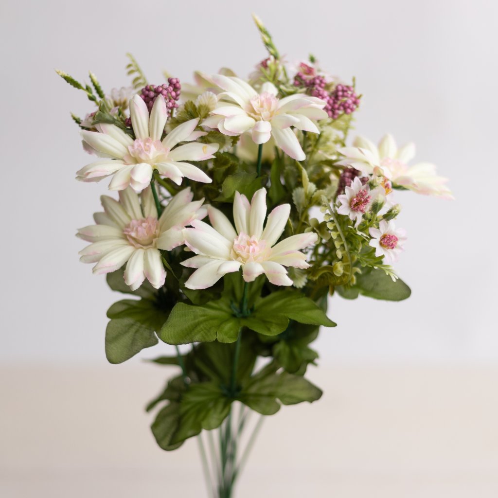 Umelá kytica lúčnych kvetov je krásnou dekoráciou, ktorá prinesie do interiéru nádych prírody a jemnej elegancie. Kombinácia kvetov, drobných ružových detailov a zelených listov vytvára prirodzený lúčny vzhľad, ktorý sa hodí do moderných aj rustikálnych aranžmánov.