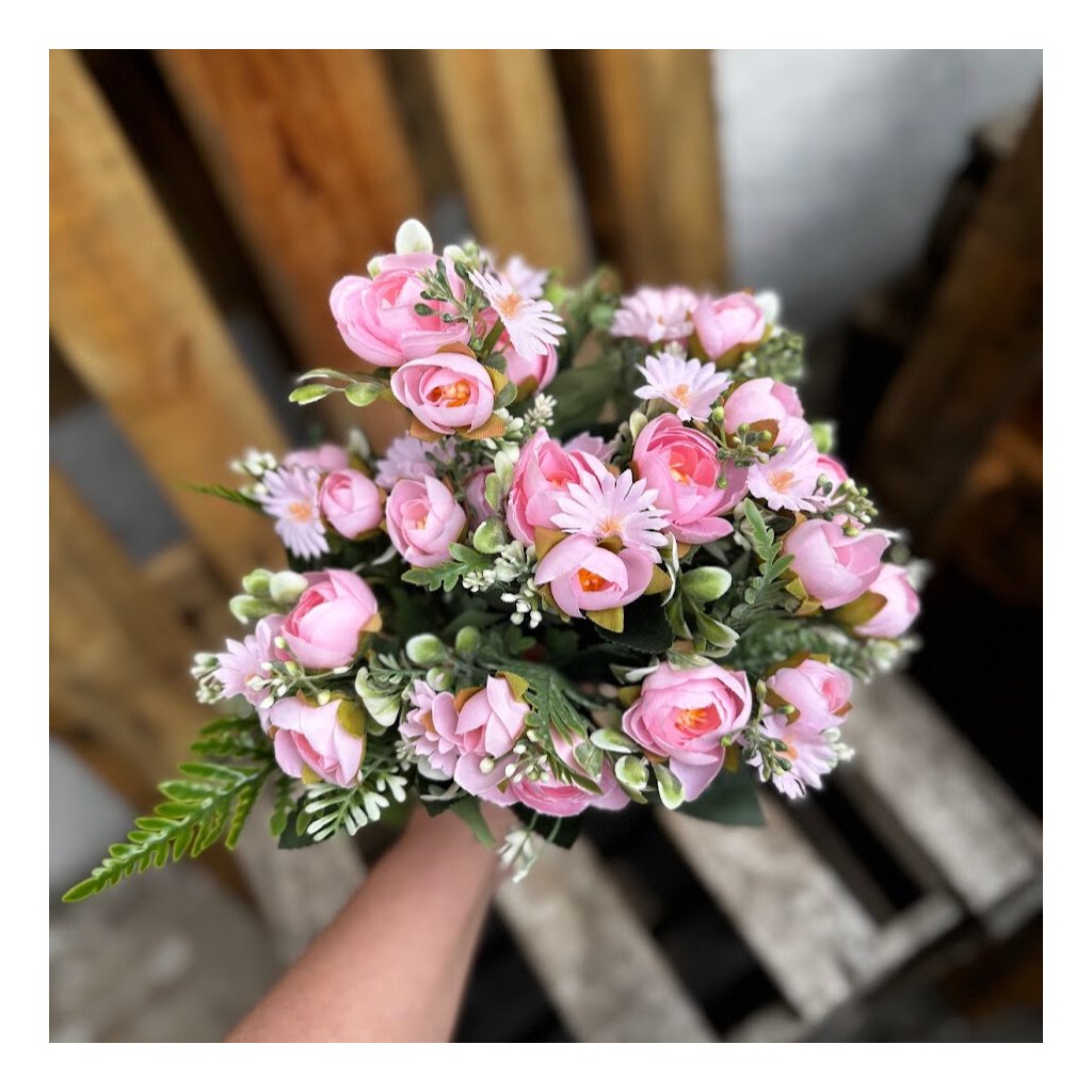 Elegantná umelá kytica v nežných ružových odtieňoch je krásnym doplnkom do každého interiéru. Kytica má výšku približne 50 cm a pozostáva z 12 bohato tvarovaných stoniek, ktoré vytvárajú plný a harmonický vzhľad. Jemné kvety doplnené zelenými lístkami pôsobia veľmi realisticky a vnášajú do priestoru sviežosť bez potreby údržby.