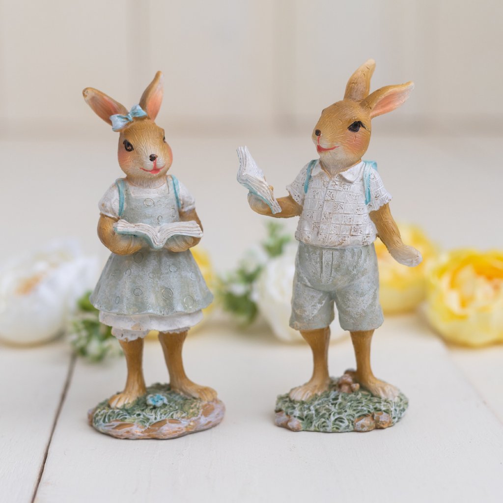 Tento milý zajačí pár v jemných pastelových farbách prinesie do vášho domova pokoj, radosť a sviatočnú veľkonočnú atmosféru. Figúrky znázorňujú zajačikov s knihou, čo dodáva dekorácii nežný a rozprávkový charakter.