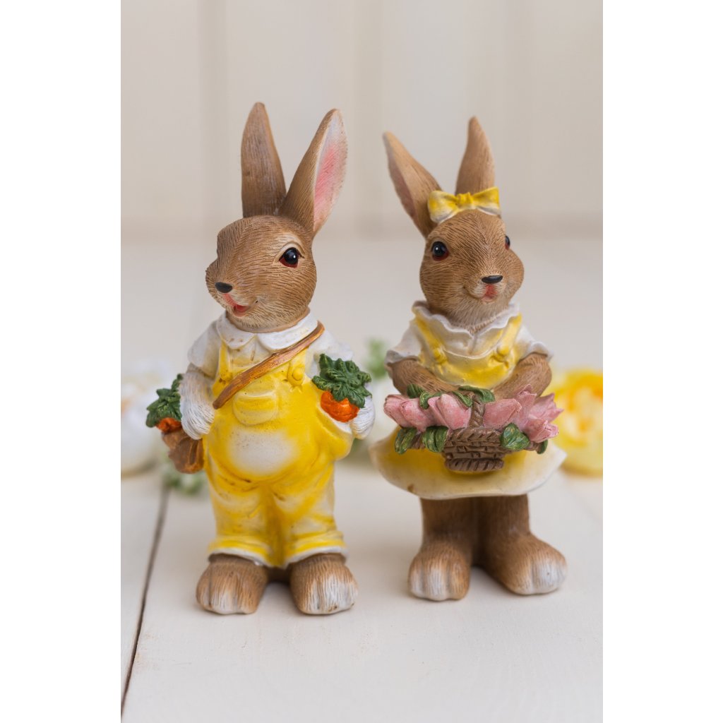 Dekoratívne figúrky zajaca a zajačice v veselom žltom oblečení prinesú do vášho domova jarnú a veľkonočnú atmosféru. Zajac drží mrkvu a zajačica má v rukách košík plný tulipánov. Jemné pastelové farby, detailné spracovanie srsti a oblečenia dodávajú figúrkam prirodzený a príjemný vzhľad.