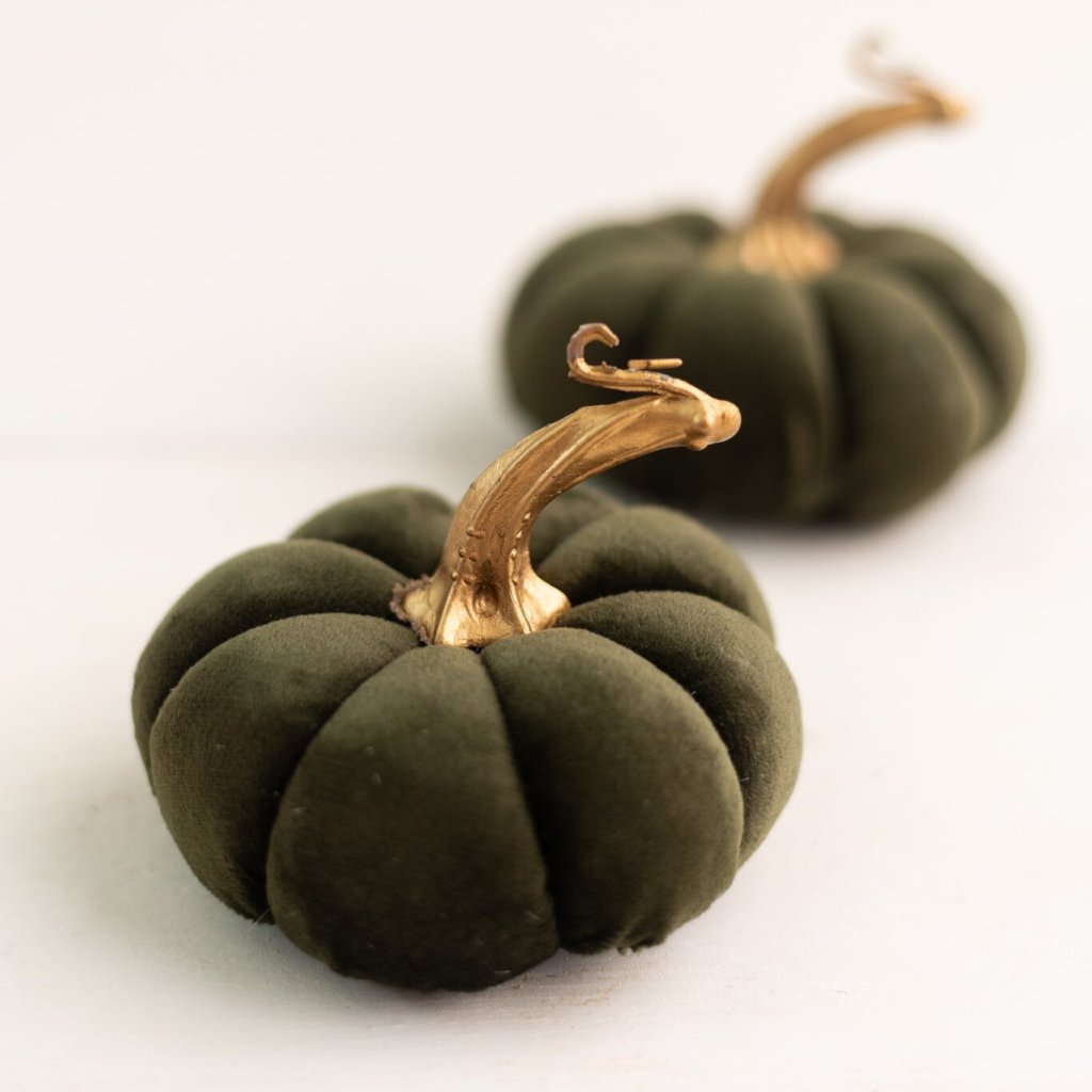 Zamatová tekvica so zlatou stopkou ZELENÁ. Priemer 10cm a výška 8cm. Perfektné na jesenné aranžovanie.