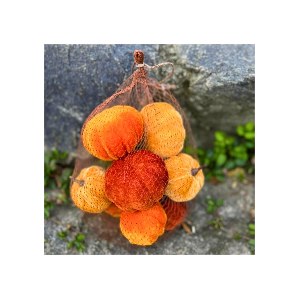 Zamatové tekvičky ORANŽOVÉ 9ks v sieťke, priemer 8cm. Perfektné na jesenné aranžovanie.