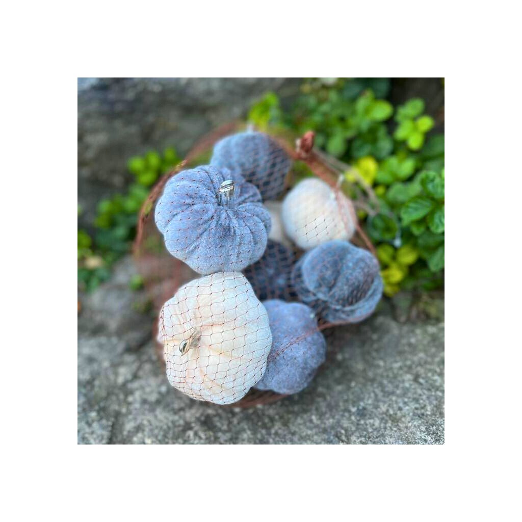 Zamatové tekvičky ŠEDÉ A BIELE 9ks v sieťke, priemer 8cm. Perfektné na jesenné aranžovanie.