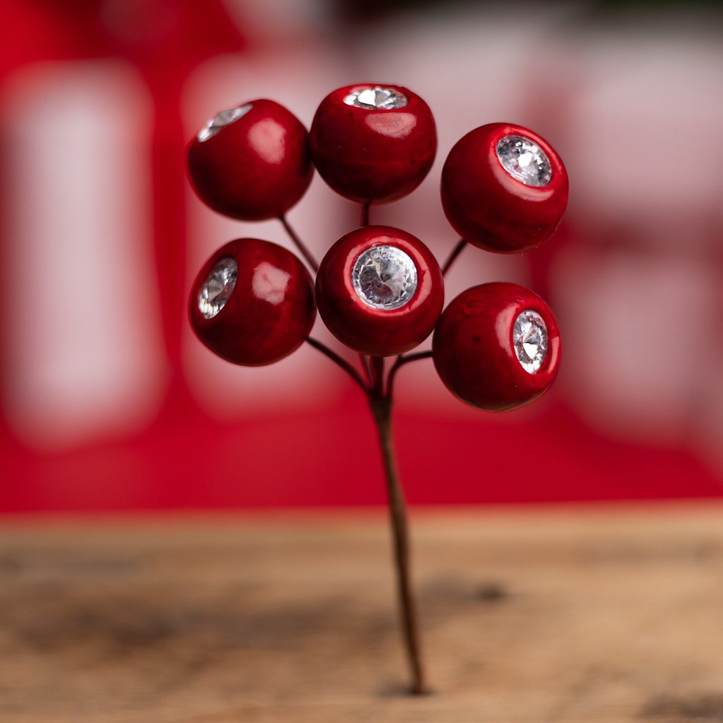 Zápich bobuľky s kamienkom ČERVENÉ 15cm. Strieborná farba kamienku.