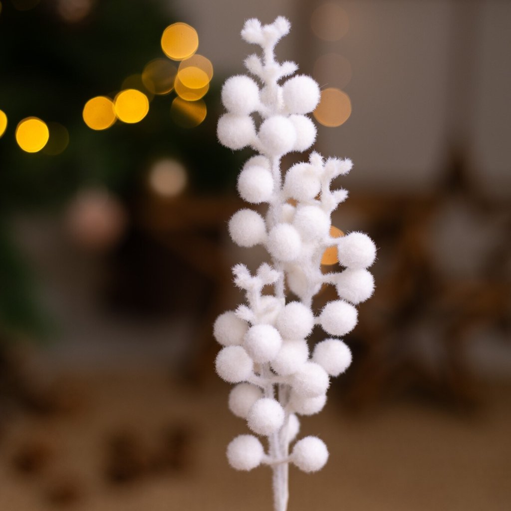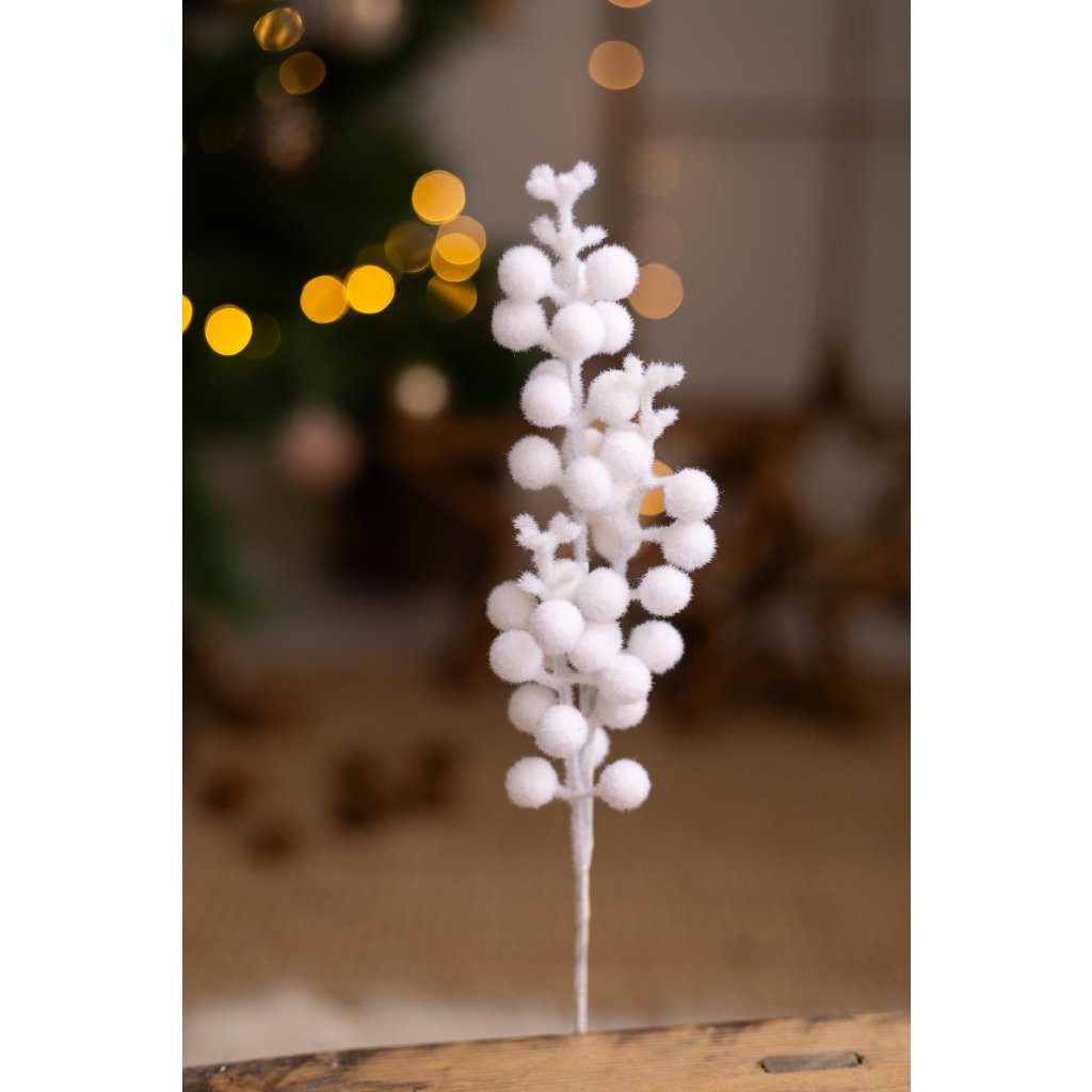 Zápich bobuľky zasnežené BIELE. Výška 41cm a 3 zápichy. Jemné chĺpky.