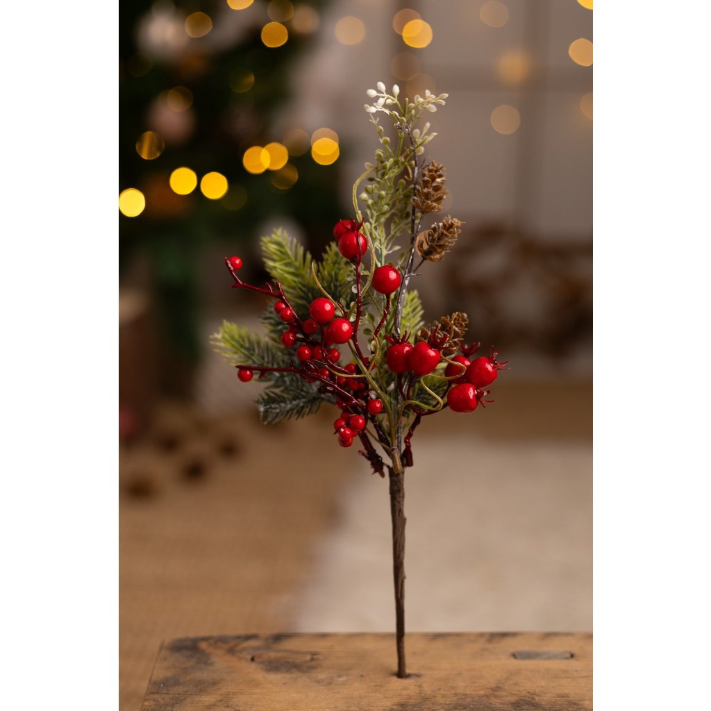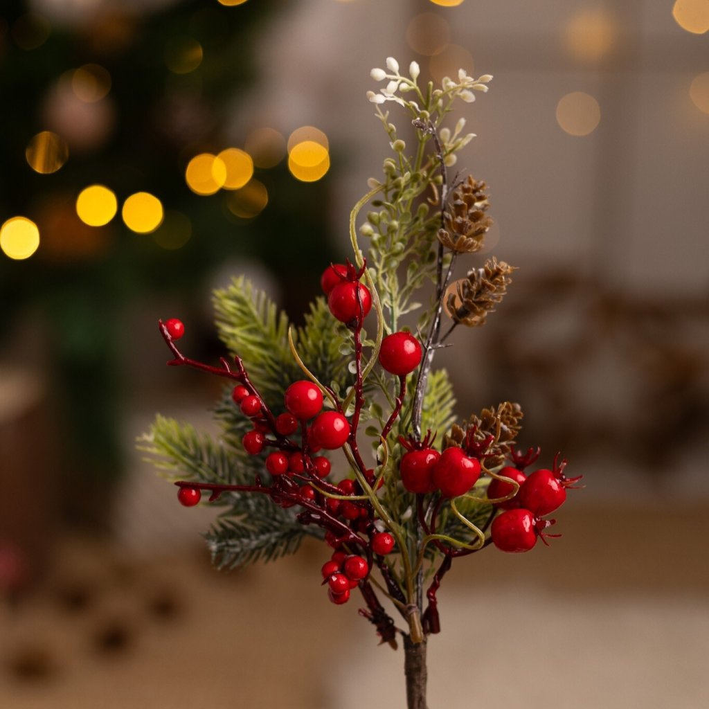 Kvalitný zápich čečina, šišky a Červené bobuľky 28cm, vhodná do zimných aj celoročných dekorácií.