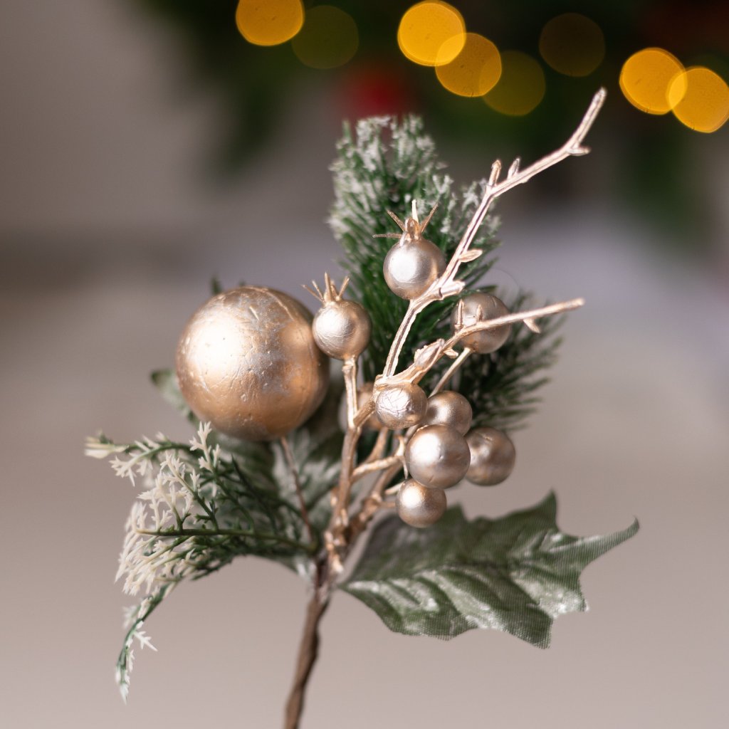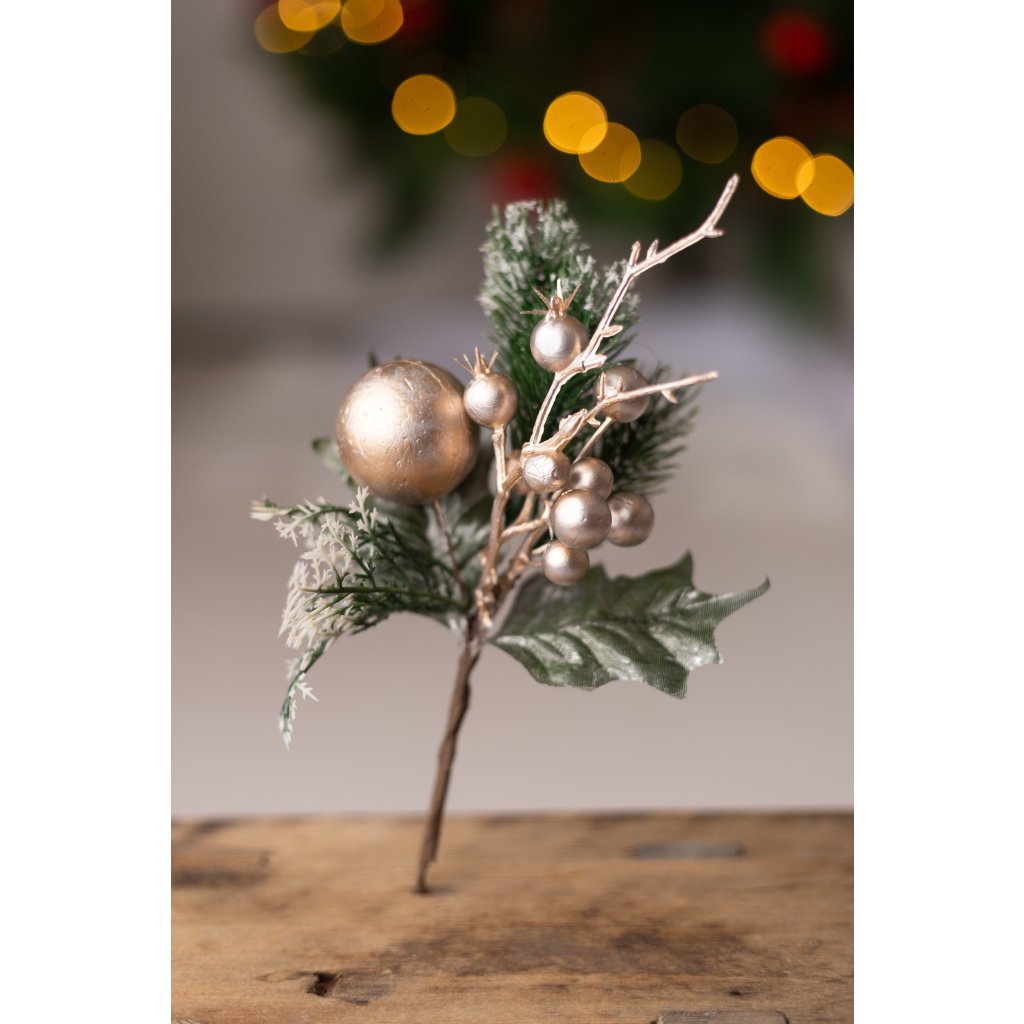 Zápich vianočná guľa s prízdobami ŠAMPANSKÁ s glitrovanými bobuľkami. Výška 25cm.