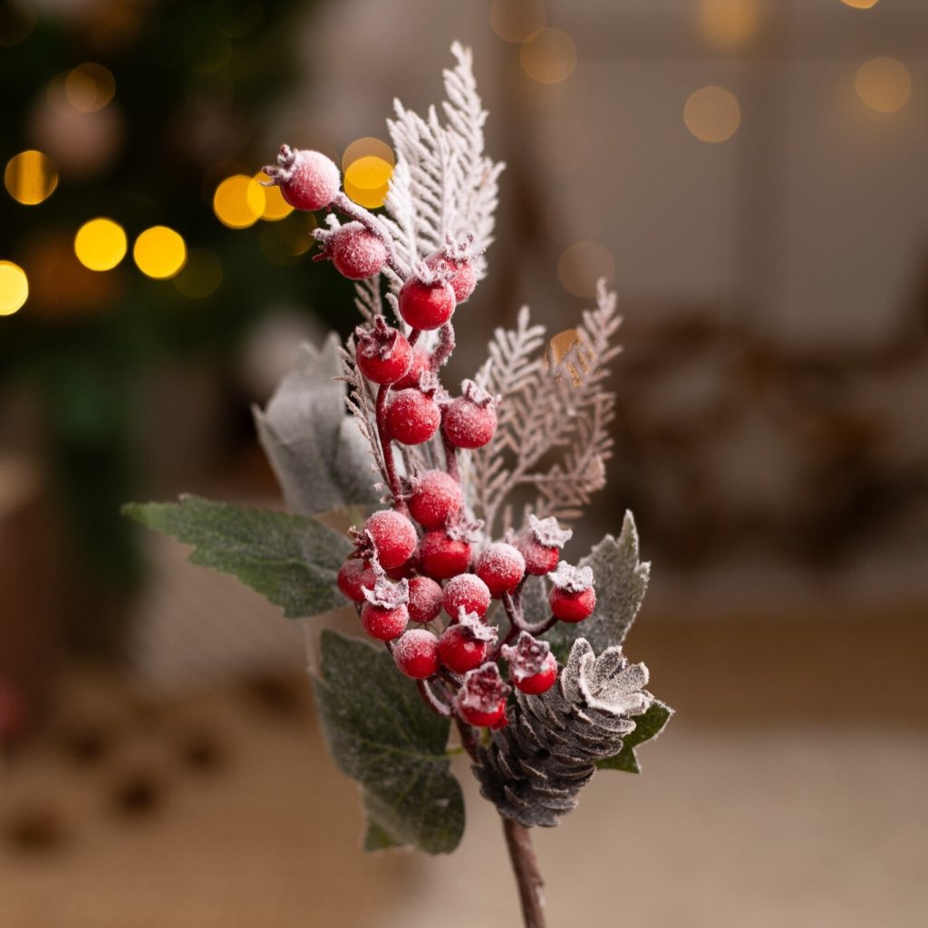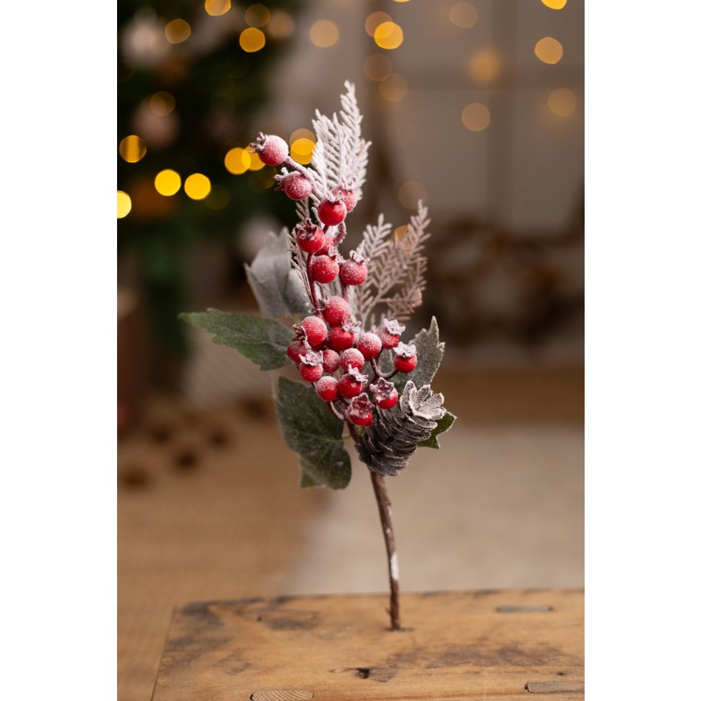Zápich hnedý konárik so šiškou a červené bobuľky 31cm. Ideálne na dekorácie a aranžovanie.