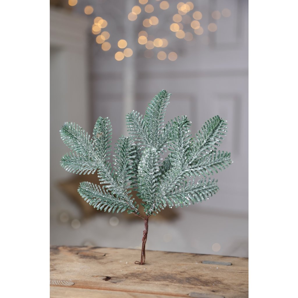 Zápich vetvička 20cm s glitrom, verne napodobňuje živé ihličie Nobilis. Ideálna na dekorácie a aranžovanie.