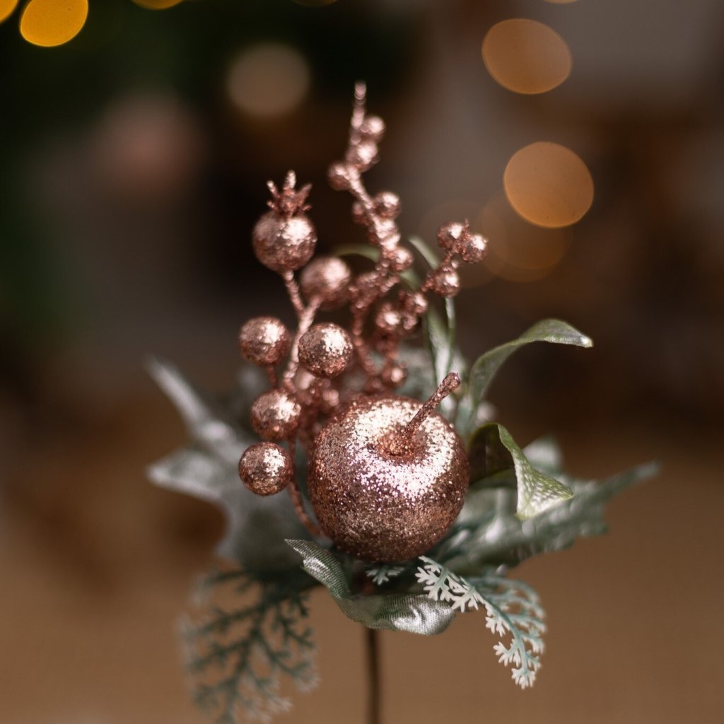 Zápich trblietavé ružové jabĺčko a bobuľky 26cm. Vhodné ako doplnok vencov a vianočných aranžmánov.