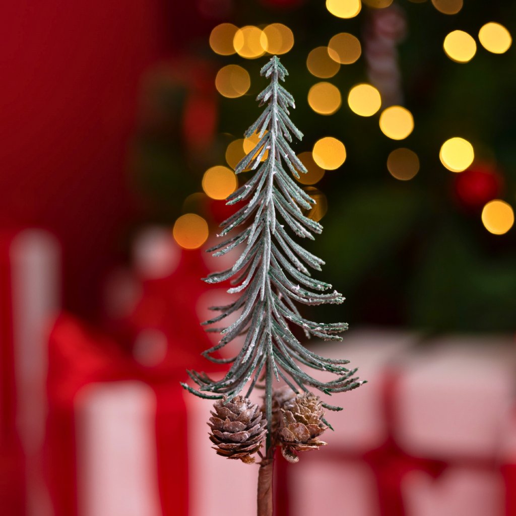 Zápich stromček zeleno šedý so šiškami 37cm. Do vianočných aranžmánov.