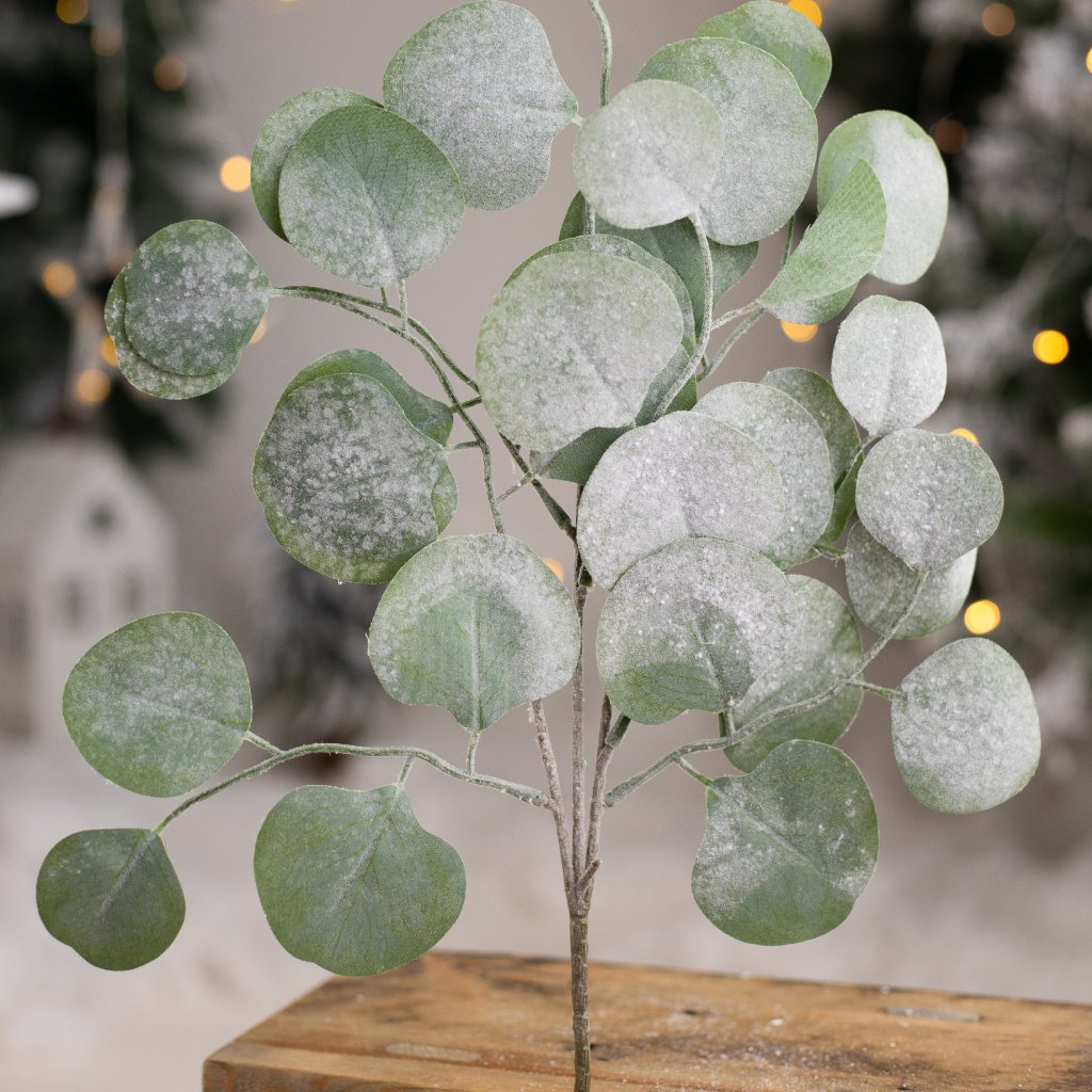 Zápich zasnežený eukalyptus 45cm. Perfektné na dekoráciu do kvetináčov alebo ako súčasť kytíc.