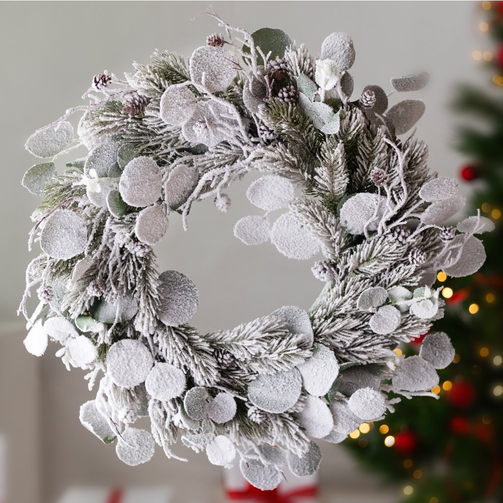 Zasnežený veniec čečina, eukalyptus a šišky 55cm