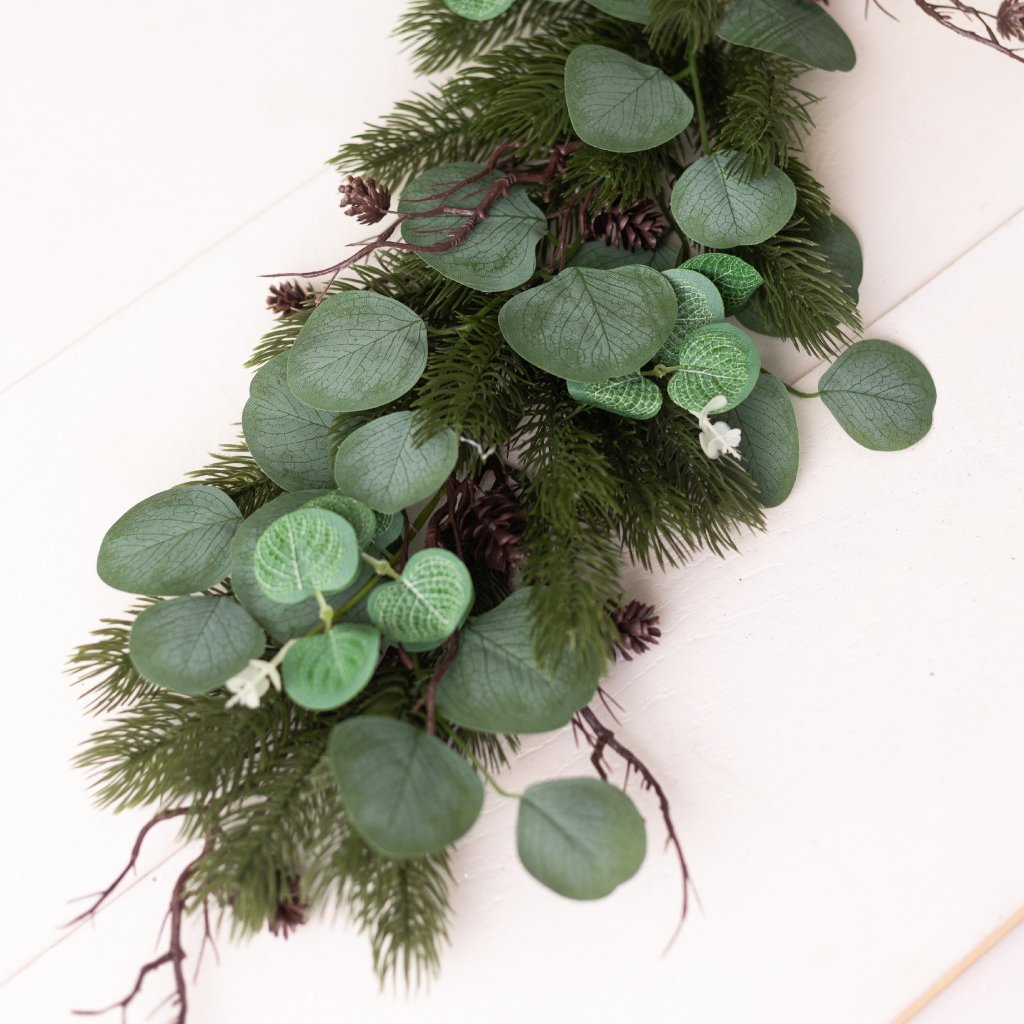 Hustý zelený 3D čečinový strapec so šiškami, eukalyptom 70cm. Vhodný na položenie a aj na aranžovanie.