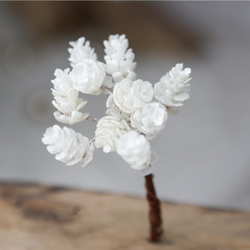 Zápich šišky BIELE 12cm. Zväzok má 10ks šišiek. Vhodné ako doplnok vencov a dekorácií.